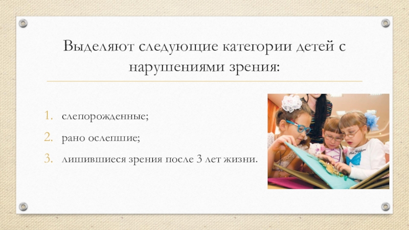 Слайд 8Выделяют следующие категории детей с нарушениями зрения: