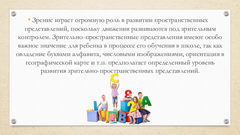 Слайд 4Зрение играет огромную роль в развитии пространственных представлений, поскольку движения развиваются