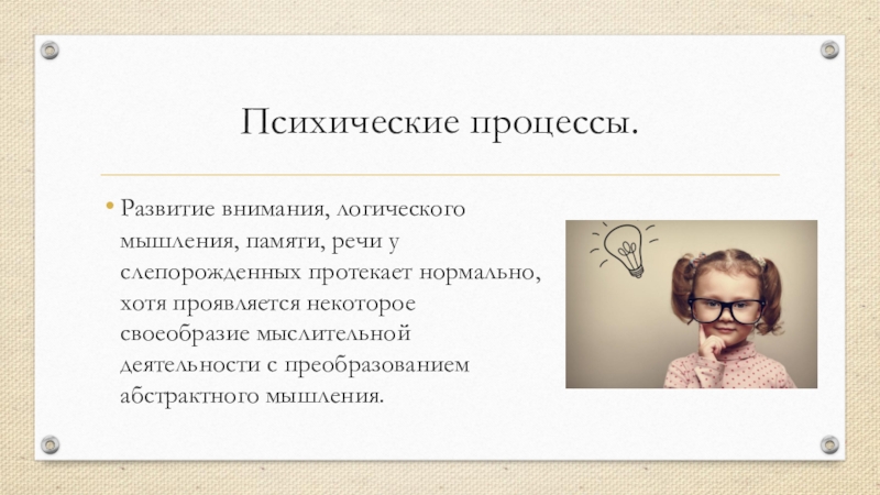 Развитие внимания, логического мышления, памяти, речи у слепорожденных протекает нормально,