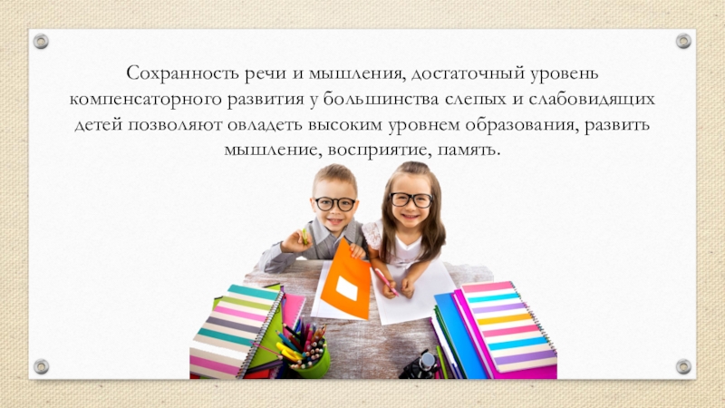 Слайд 21Сохранность речи и мышления, достаточный уровень компенсаторного развития у большинства слепых