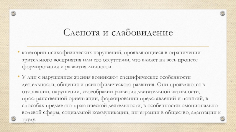 У лиц с нарушением зрения возникают специфические особенности деятельности, общения и психофизического развития. Они проявляются в отставании, нарушении, своеобразии развития двигательной активности, пространственной ориентации, формировании представлений и понятий, в способах предметно-практической деятельности, в особенностях эмоционально-волевой сферы, социальной коммуникации, интеграции в общество, адаптации к труду.