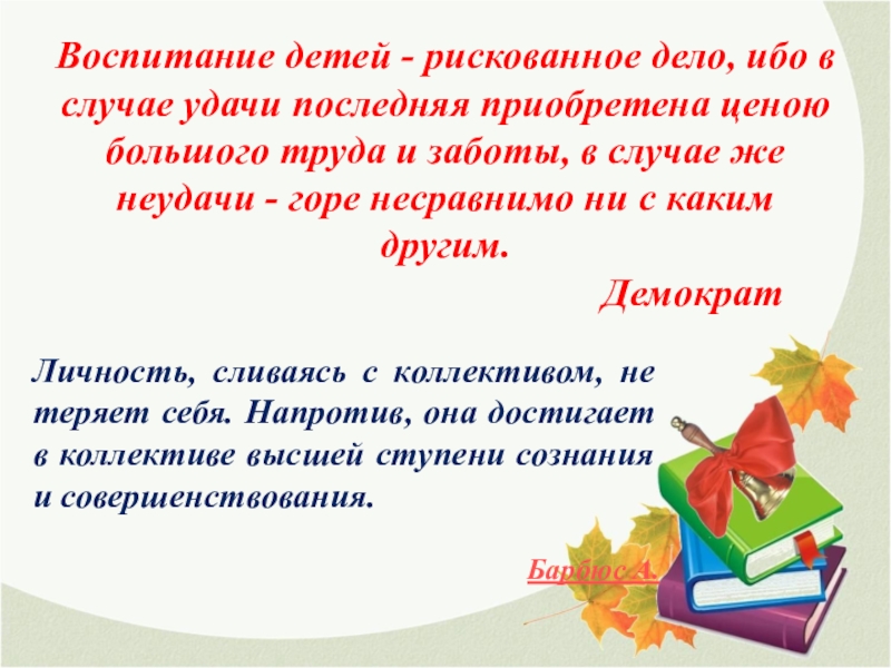 Личность, сливаясь с коллективом, не теряет себя. Напротив, она достигает в коллективе высшей ступени сознания и совершенствования.