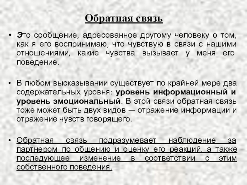 В любом высказывании существует по крайней мере два содержательных уровня: уровень информационный и уровень эмоциональный. В этой связи обратная связь тоже может быть двух видов — отражение информации и отражение чувств говорящего.