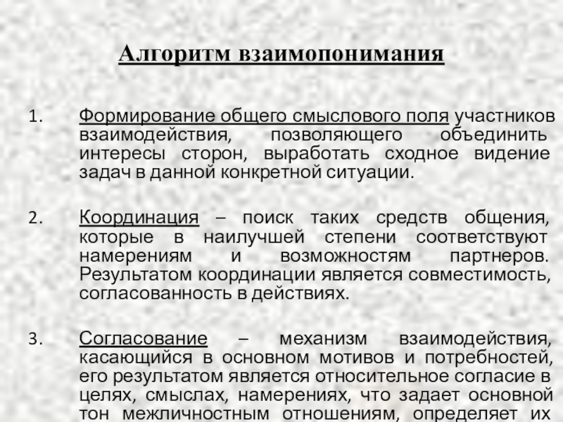 Согласование – механизм взаимодействия, касающийся в основном мотивов и потребностей, его результатом является относительное согласие в целях, смыслах, намерениях, что задает основной тон межличностным отношениям, определяет их эмоциональную окраску.