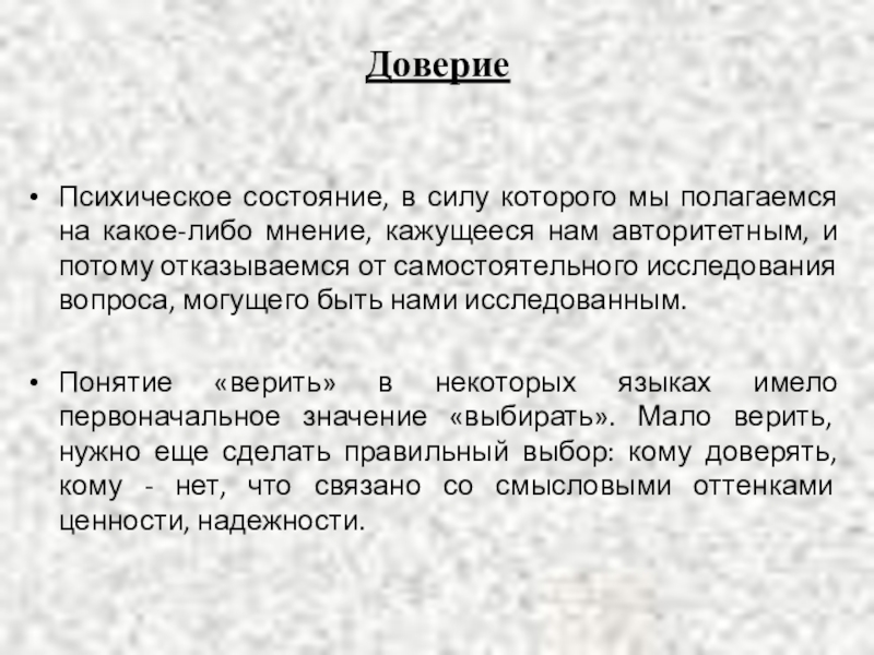 Понятие «верить» в некоторых языках имело первоначальное значение «выбирать». Мало верить, нужно еще сделать правильный выбор: кому доверять, кому - нет, что связано со смысловыми оттенками ценности, надежности.