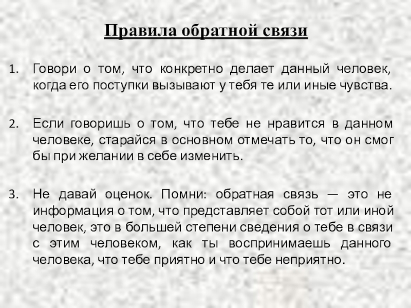 Не давай оценок. Помни: обратная связь — это не информация о том, что представляет собой тот или иной человек, это в большей степени сведения о тебе в связи с этим человеком, как ты воспринимаешь данного человека, что тебе приятно и что тебе неприятно.