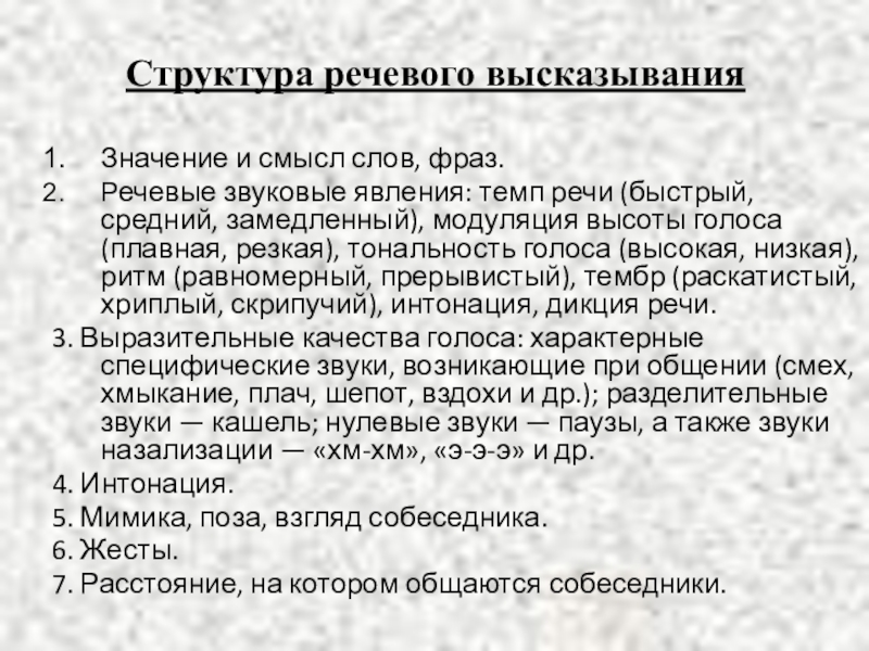 3. Выразительные качества голоса: характерные специфические звуки, возникающие при общении (смех, хмыкание, плач, шепот, вздохи и др.); разделительные звуки — кашель; нулевые звуки — паузы, а также звуки назализации — «хм-хм», «э-э-э» и др.