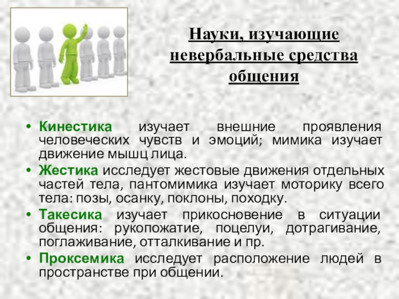 Жестика исследует жестовые движения отдельных частей тела, пантомимика изучает моторику всего тела: позы, осанку, поклоны, походку.