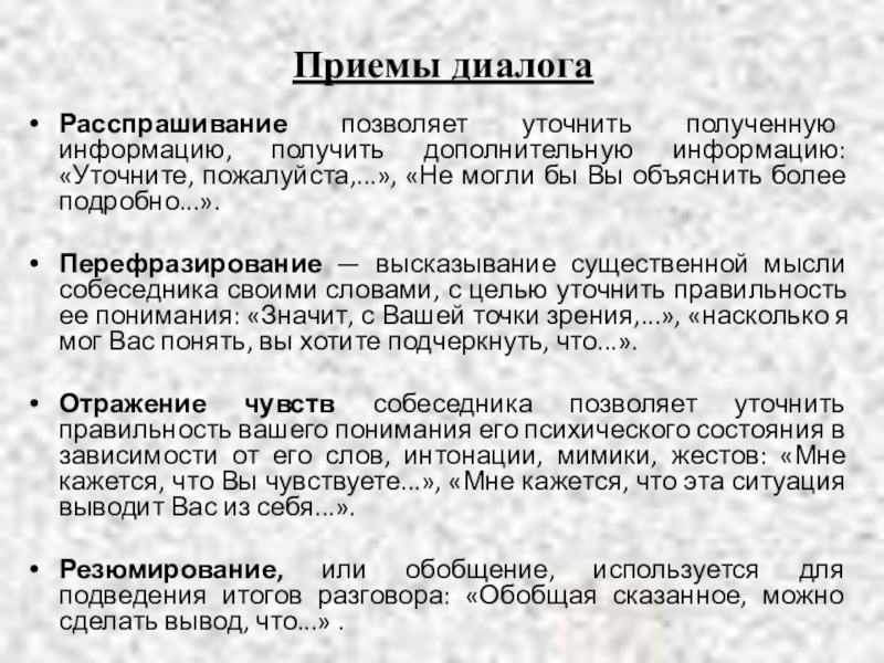 Перефразирование — высказывание существенной мысли собеседника своими словами, с целью уточнить правильность ее понимания: «Значит, с Вашей точки зрения,...», «насколько я мог Вас понять, вы хотите подчеркнуть, что...».