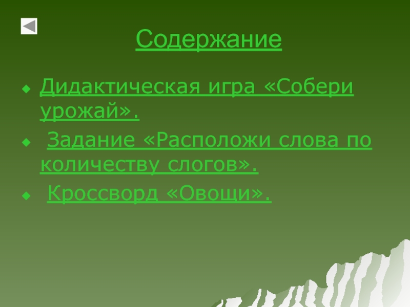 СодержаниеДидактическая игра «Собери урожай». Задание «Расположи слова по количеству слогов». Кроссворд «Овощи».
