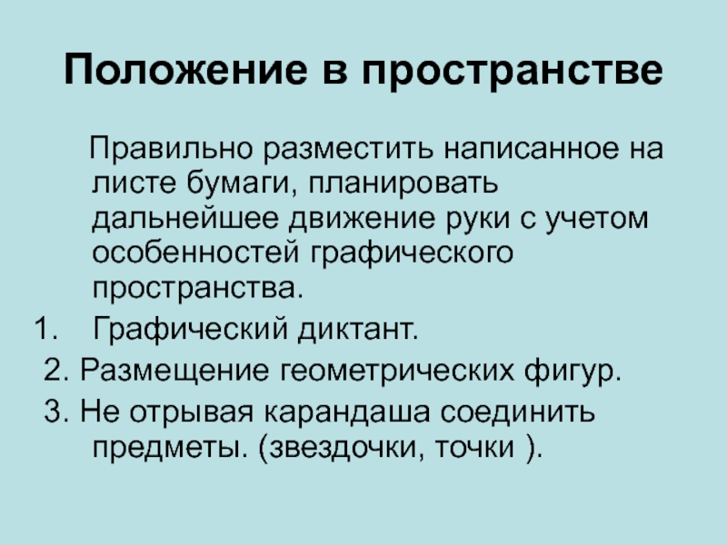 Положение в пространстве   Правильно разместить написанное на листе бумаги, планировать дальнейшее движение руки с учетом