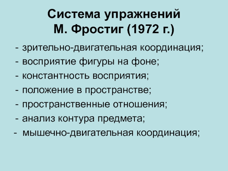 Система упражнений М. Фростиг (1972 г.)зрительно-двигательная координация;восприятие фигуры на фоне;константность восприятия;положение в пространстве;пространственные отношения;анализ контура предмета;- мышечно-двигательная координация;