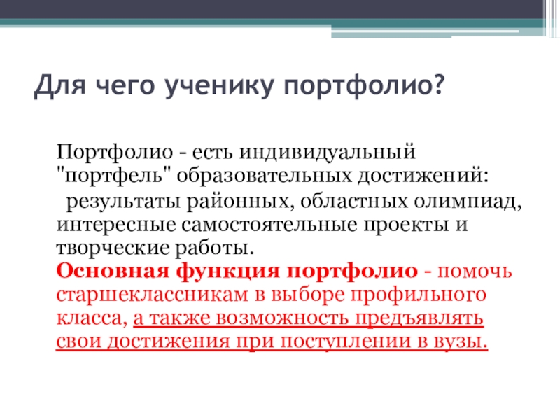 Основная функция портфолио - помочь старшеклассникам в выборе профильного класса, а также возможность предъявлять свои достижения при поступлении в вузы.