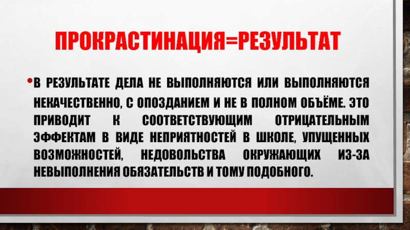 чувств и перерасхода сил (сначала — на второстепенные дела и борьбу с нарастающей тревогой, затем — на работу в авральном темпе) может спровоцировать дальнейшую прокрастинацию, нежелание вообще что-либо делать.