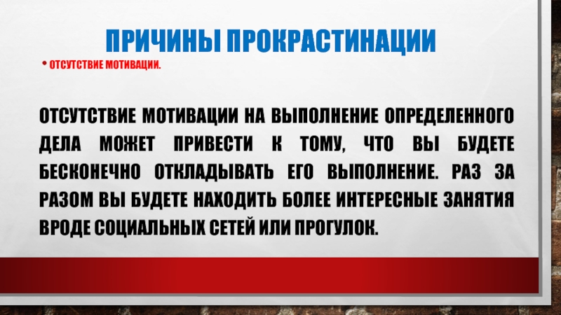 к тому, что вы будете бесконечно откладывать его выполнение. Раз за разом вы будете находить более интересные занятия вроде социальных сетей или прогулок.