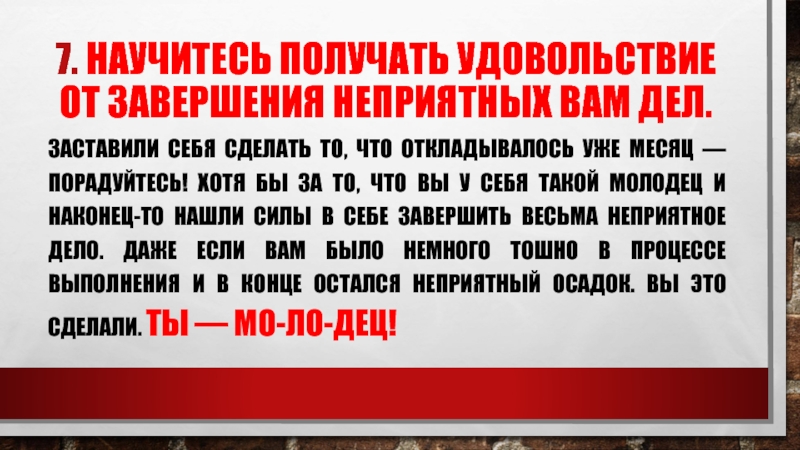 Слайд 377. Научитесь получать удовольствие от завершения неприятных вам дел.
