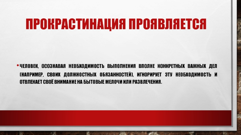 в психологии склонность к постоянному откладыванию даже важных и срочных дел, приводящая к жизненным проблемам и болезненным психологическим эффектам.