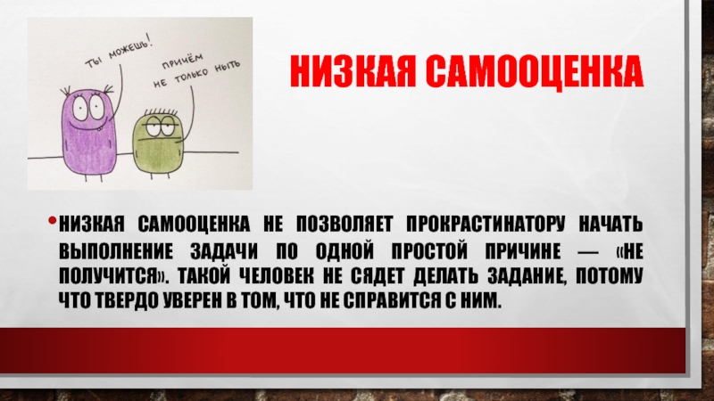 Низкая самооценка не позволяет прокрастинатору начать выполнение задачи по одной