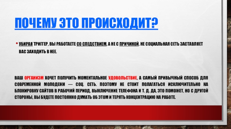 Ваш организм хочет получить моментальное удовольствие, а самый привычный способ для современной молодежи — соц. сеть. Поэтому не стоит полагаться исключительно на блокировку сайтов в рабочий период, выключение телефона и т. д. Да, это поможет, но с другой стороны, вы будете постоянно думать об этом и терять концентрацию на работе.