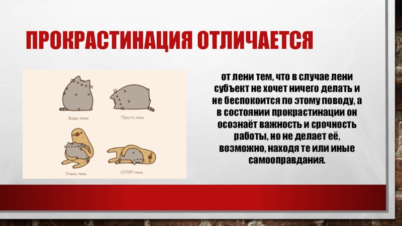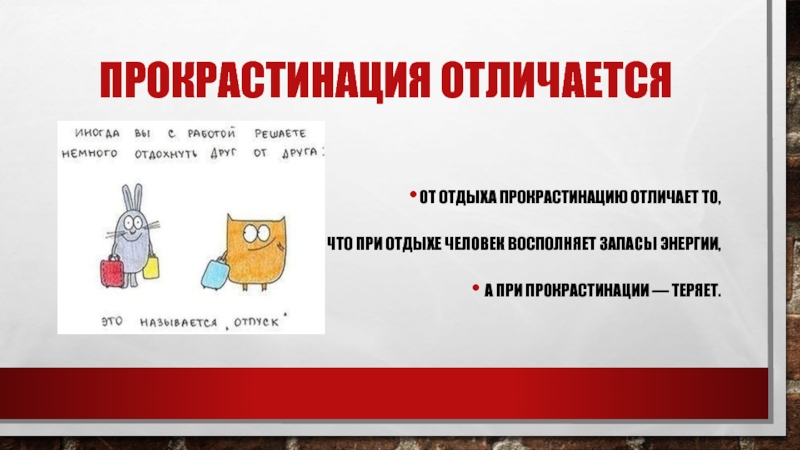 ничего делать и не беспокоится по этому поводу, а в состоянии прокрастинации он осознаёт важность и срочность работы, но не делает её, возможно, находя те или иные самооправдания.