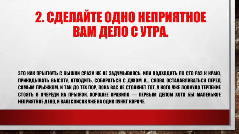 прыгнуть с вышки сразу же не задумываясь. Или подходить по сто раз к краю, прикидывать высоту, отходить, собираться с духом и… снова останавливаться перед самым прыжком. И так до тех пор, пока вас не столкнет тот, у кого уже лопнуло терпение стоять в очереди на прыжок. Хорошее правило — первым делом хотя бы маленькое неприятное дело, и ваш список уже на один пункт короче.