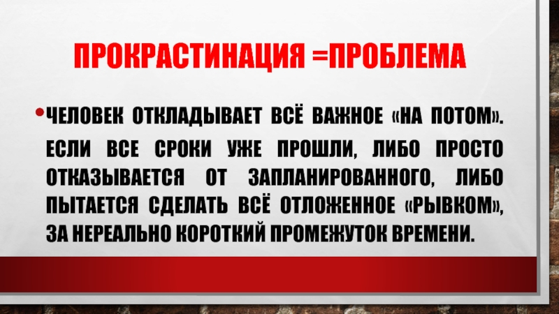 прошли, либо просто отказывается от запланированного, либо пытается сделать всё отложенное «рывком», за нереально короткий промежуток времени.