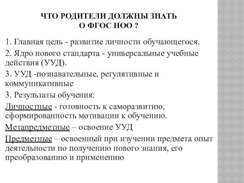 Что родители должны знать  о ФГОС НОО ?1. Главная цель - развитие личности обучающегося.2. Ядро нового