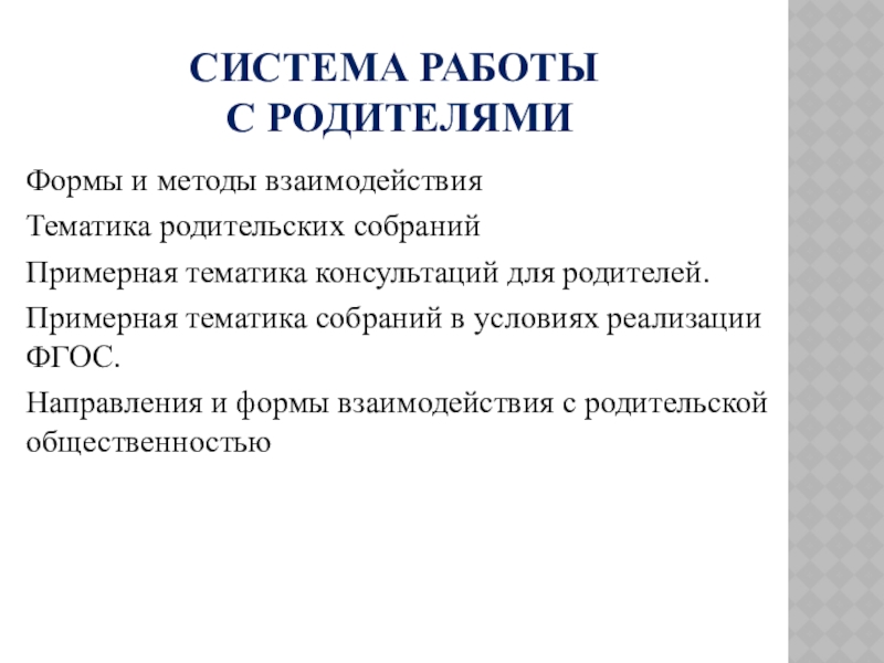 Система работы  с родителямиФормы и методы взаимодействияТематика родительских собранийПримерная тематика консультаций для родителей.Примерная тематика собраний в
