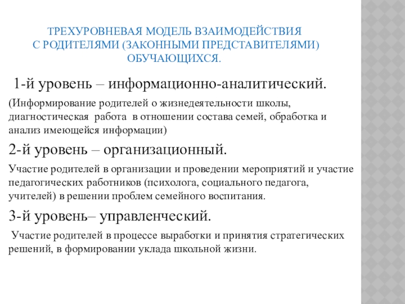 Слайд 3Трехуровневая модель взаимодействия с родителями (законными представителями) обучающихся.