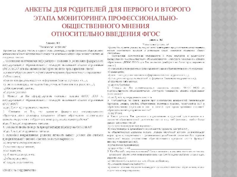 Слайд 4 Анкеты для родителей для первого и второго этапа мониторинга профессионально-общественного