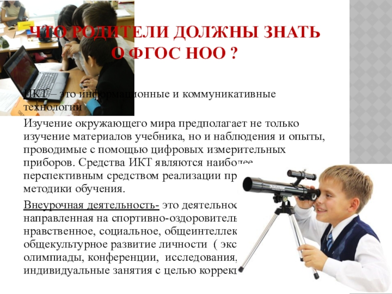 Что родители должны знать  о ФГОС НОО ?ИКТ – это информационные и коммуникативные технологииИзучение окружающего мира