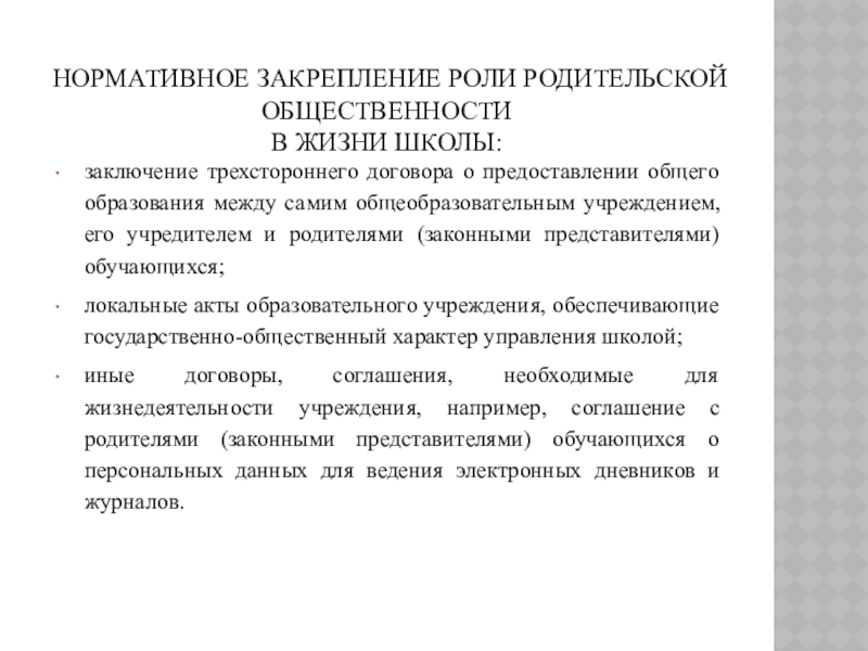 Нормативное закрепление роли родительской общественности в жизни школы: заключение трехстороннего договора о предоставлении общего образования между самим общеобразовательным учреждением, его учредителем и родителями (законными представителями) обучающихся;локальные акты образовательного учреждения, обеспечивающие государственно-общественный характер управления