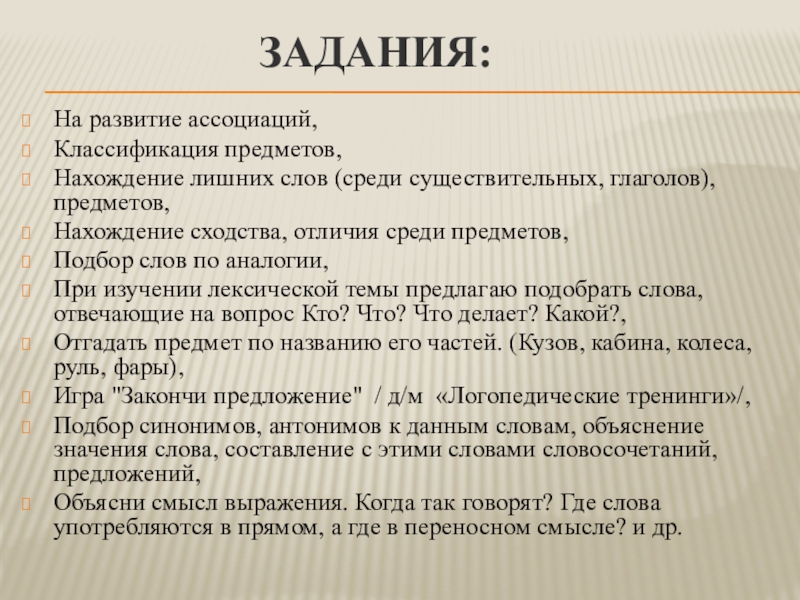 Нахождение лишних слов (среди существительных, глаголов), предметов,