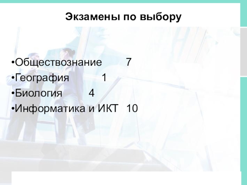 Экзамены по выборуОбществознание 7 География 1 Биология 4Информатика и ИКТ 10