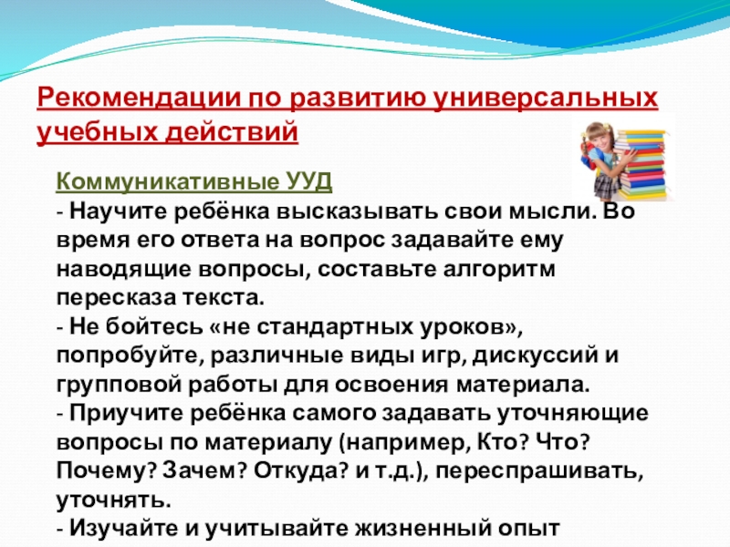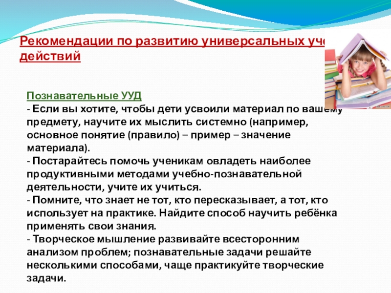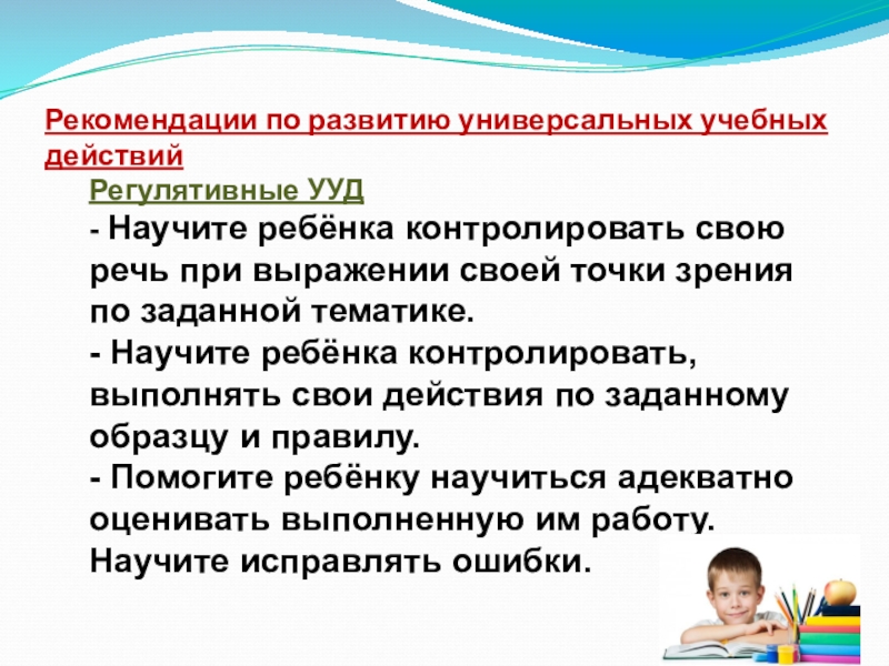 Слайд 19Рекомендации по развитию универсальных учебных действий