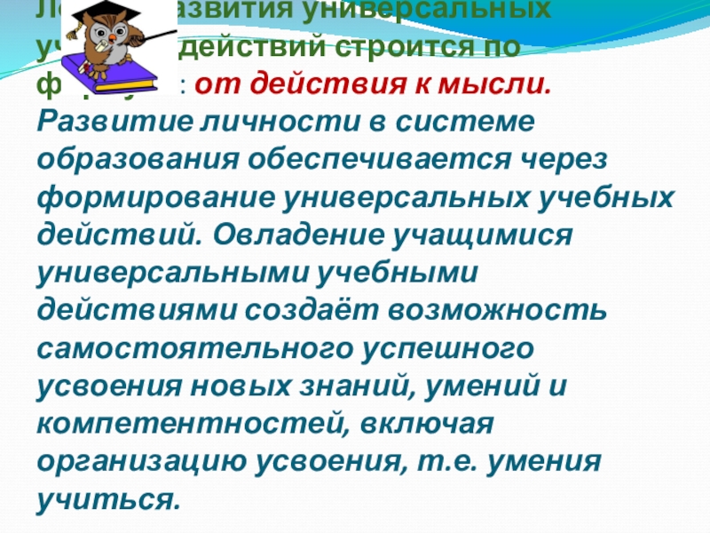 Слайд 4Логика развития универсальных учебных действий строится по формуле: от действия к