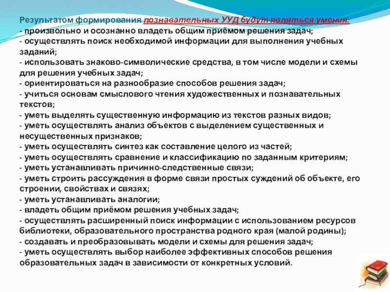 Слайд 13Результатом формирования познавательных УУД будут являться умения: