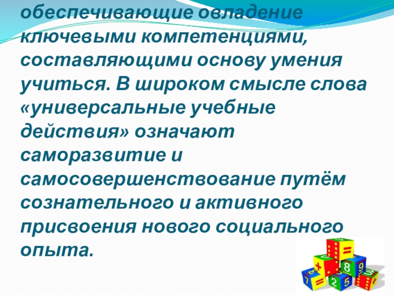 овладение ключевыми компетенциями, составляющими основу умения учиться. В широком смысле слова «универсальные учебные действия» означают саморазвитие и самосовершенствование путём сознательного и активного присвоения нового социального опыта.