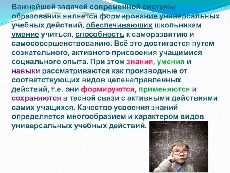 Слайд 6Важнейшей задачей современной системы образования является формирование универсальных учебных действий, обеспечивающих