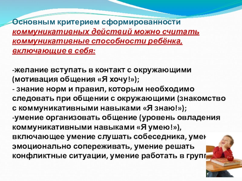 Слайд 14Основным критерием сформированности коммуникативных действий можно считать коммуникативные способности ребёнка, включающие