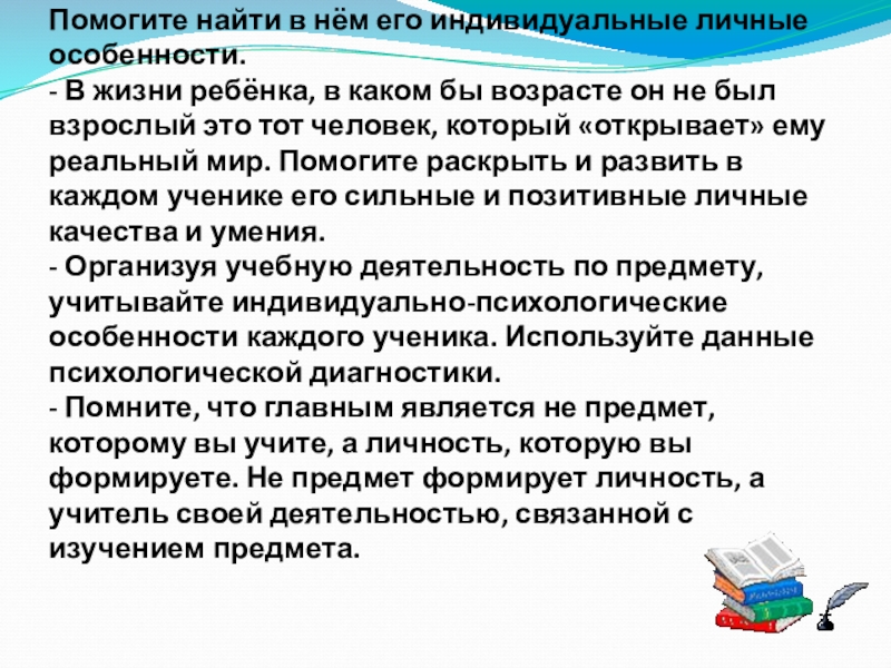 - Помните, что главным является не предмет, которому вы учите, а личность, которую вы формируете. Не предмет формирует личность, а учитель своей деятельностью, связанной с изучением предмета.