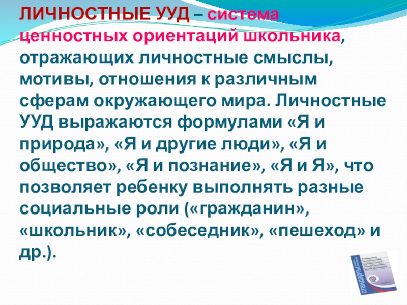 отношения к различным сферам окружающего мира. Личностные УУД выражаются формулами «Я и природа», «Я и другие люди», «Я и общество», «Я и познание», «Я и Я», что позволяет ребенку выполнять разные социальные роли («гражданин», «школьник», «собеседник», «пешеход» и др.).