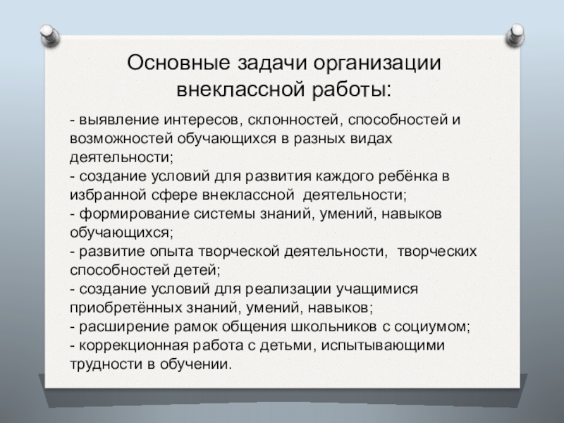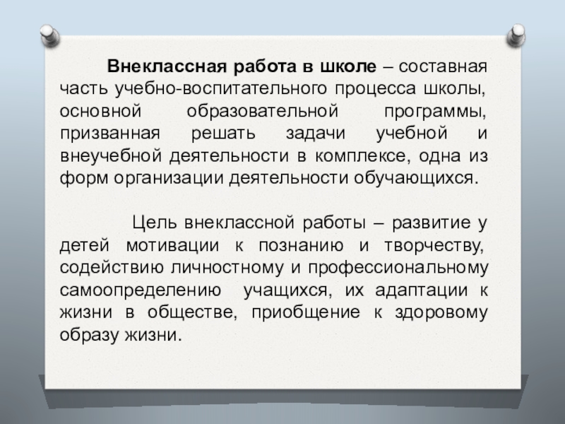 Внеклассная работа - это организованные и целенаправленные занятия с учащимися, проводимые школой для расширения и углубления знаний, умений, навыков развития индивидуальных способностей учащихся, а также как организация их разумного отдыха