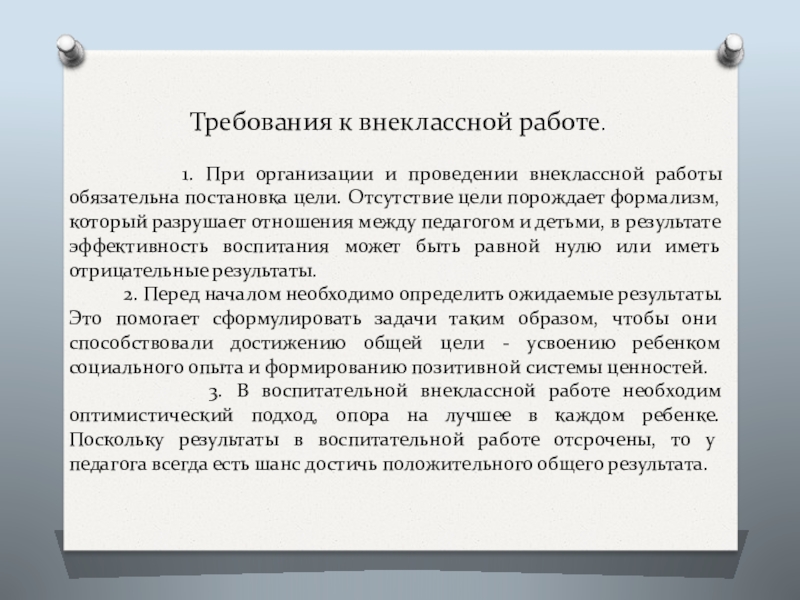 организации и проведении внеклассной работы обязательна постановка цели. Отсутствие цели порождает формализм, который разрушает отношения между педагогом и детьми, в результате эффективность воспитания может быть равной нулю или иметь отрицательные результаты.