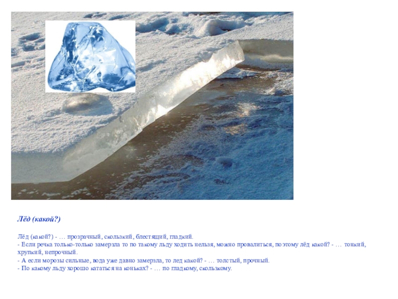 - Если речка только-только замерзла то по такому льду ходить нельзя, можно провалиться, поэтому лёд какой? - … тонкий, хрупкий, непрочный.