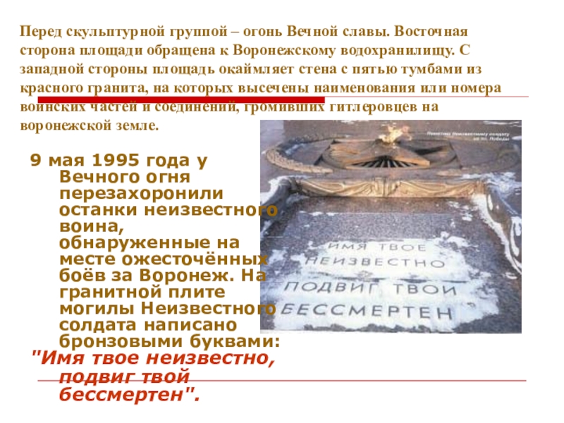 9 мая 1995 года у Вечного огня перезахоронили останки неизвестного воина, обнаруженные на месте ожесточённых боёв за Воронеж. На гранитной плите могилы Неизвестного солдата написано бронзовыми буквами:
