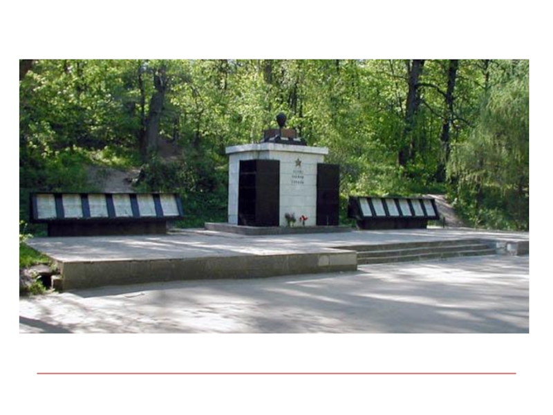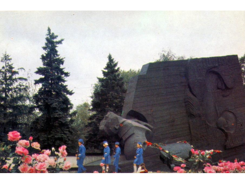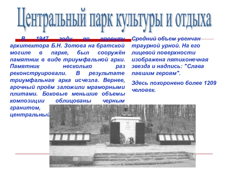 в парке, был сооружён памятник в виде триумфальной арки. Памятник несколько раз реконструировали. В результате триумфальная арка исчезла. Вернее, арочный проём заложили мраморными плитами. Боковые меньшие объемы композиции облицованы черным гранитом, более высокий центральный – белым мрамором.