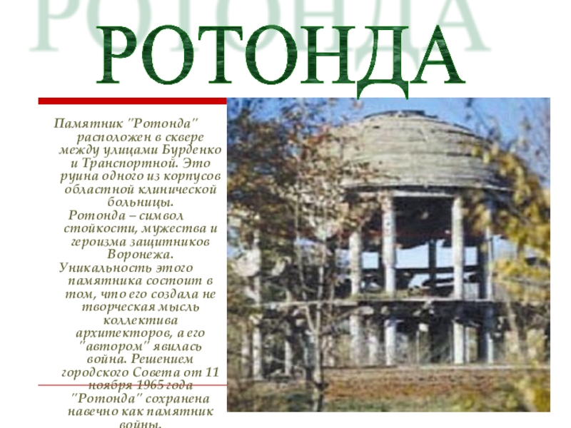 Уникальность этого памятника состоит в том, что его создала не творческая мысль коллектива архитекторов, а его "автором" явилась война. Решением городского Совета от 11 ноября 1965 года "Ротонда" сохранена навечно как памятник войны.