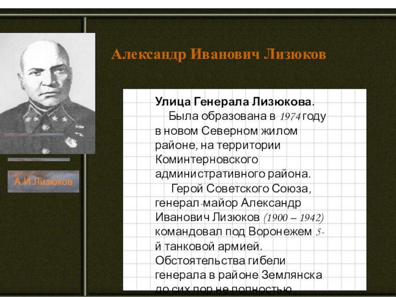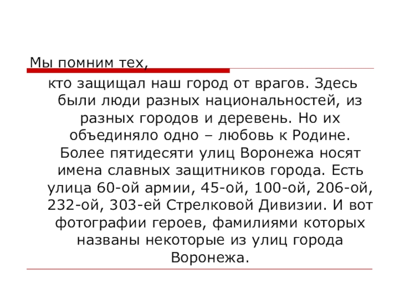 были люди разных национальностей, из разных городов и деревень. Но их объединяло одно – любовь к Родине. Более пятидесяти улиц Воронежа носят имена славных защитников города. Есть улица 60-ой армии, 45-ой, 100-ой, 206-ой, 232-ой, 303-ей Стрелковой Дивизии. И вот фотографии героев, фамилиями которых названы некоторые из улиц города Воронежа.
