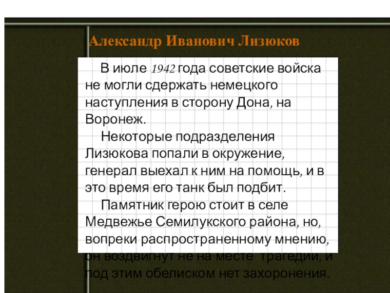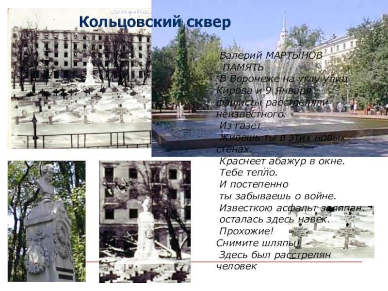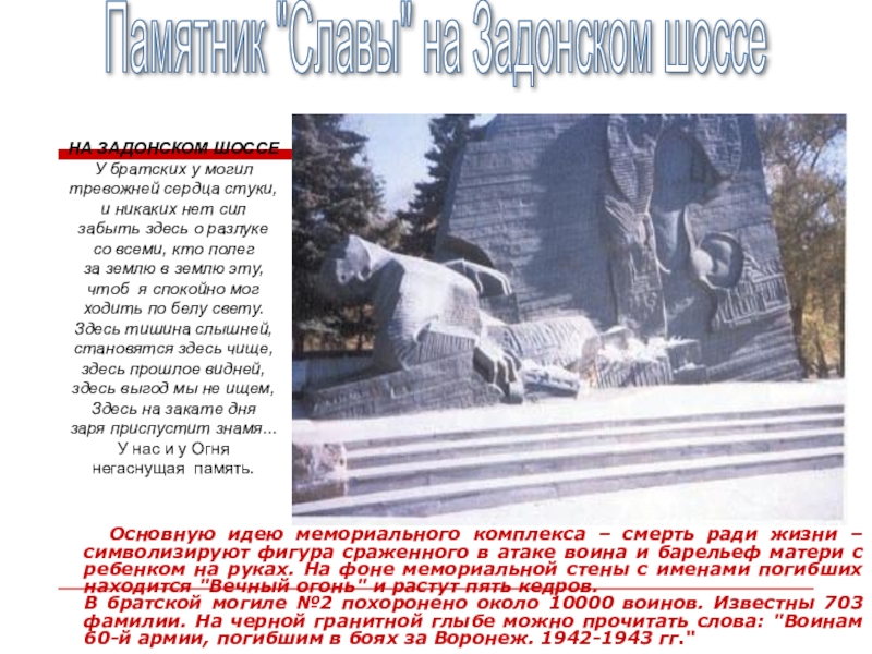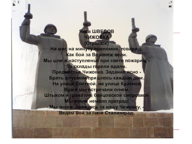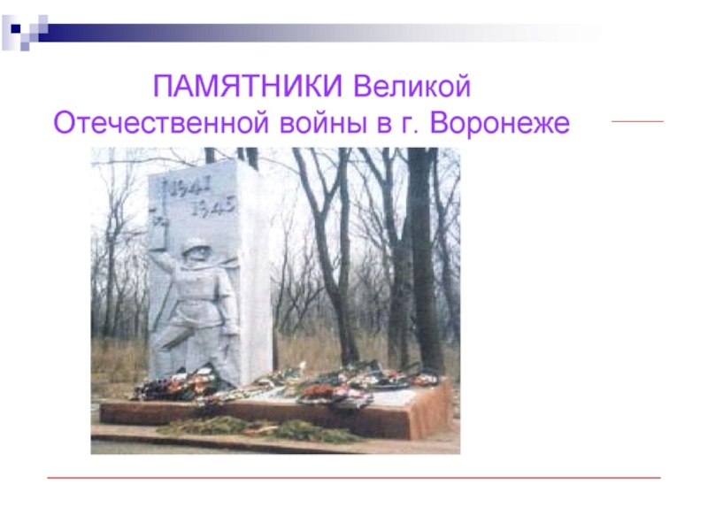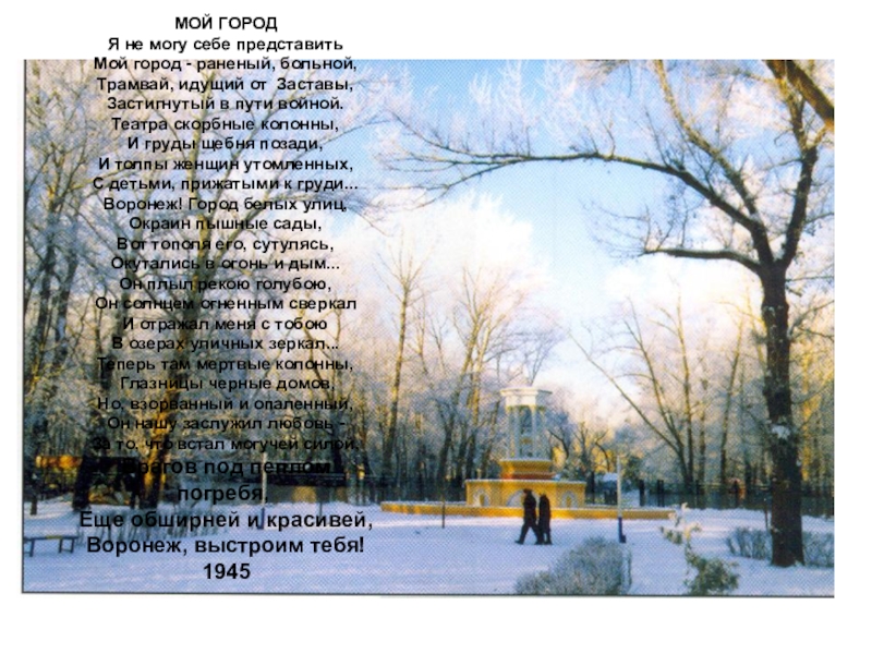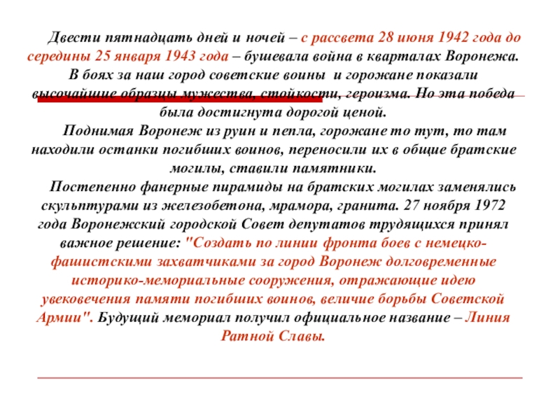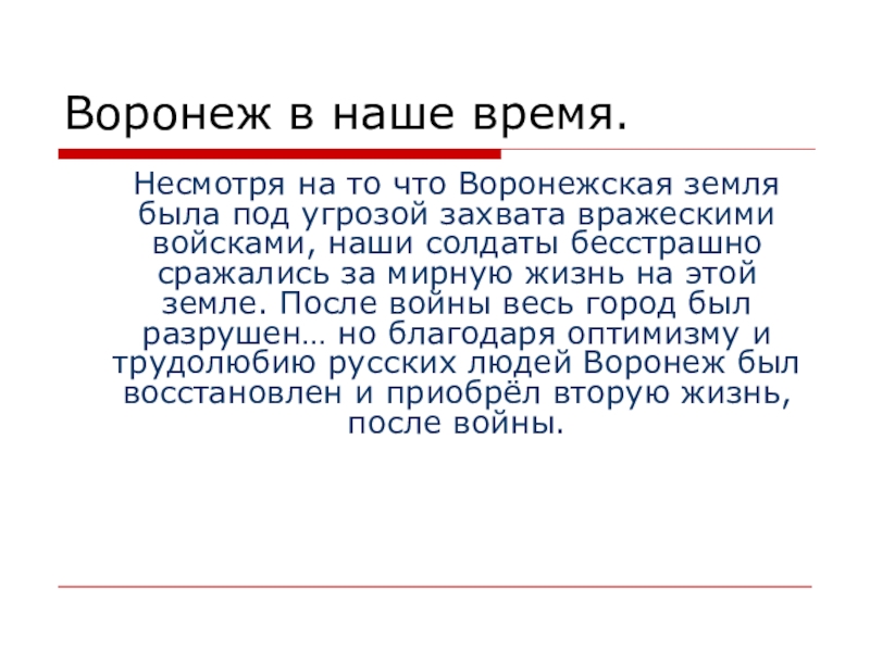 угрозой захвата вражескими войсками, наши солдаты бесстрашно сражались за мирную жизнь на этой земле. После войны весь город был разрушен… но благодаря оптимизму и трудолюбию русских людей Воронеж был восстановлен и приобрёл вторую жизнь, после войны.